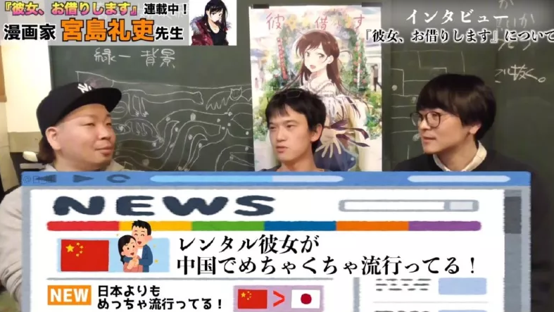 而在近日《租借女友》的作者宫岛礼吏表示,《租借女友》这部漫画的来源于中国的一则新闻。具体是哪个新闻暂时还不知道,但是新闻的内容是在春节的时候有人租借女友回家过节的新闻。