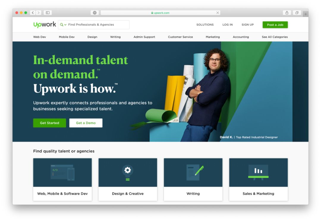与 freelancer 一样,该平台上也为多种不同行业提供服务,而不仅局限于软件外包。诸如微软、Airbnb 等知名企业,都跟 upwork 有过合作。