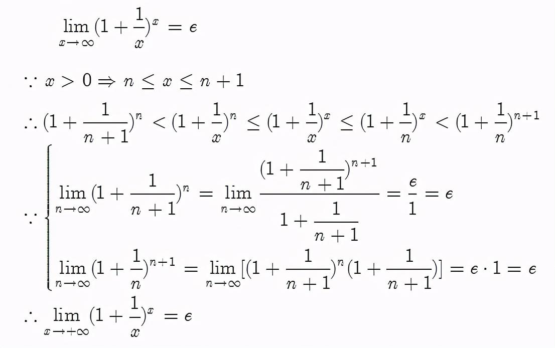 这个推导过程强烈建议自己推导几遍。一来可以加深对e这个值(仅仅是数值,还不是物理意义)的由来,二来可以充分体会夹逼原理。