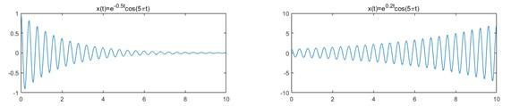 我们可以看到,复指函数中,x=a+ib,a对应着e^a,就是图形的包络,决定图形的最终趋势,是发散的a>0,还是收敛的a<0,还是不变的a=0。b对应着怎么走向趋势,e^ib=cos+isin。简单一句话,就是振荡着过去的。看着下面两张图,细品一下,a和b的作用,趋势和振荡。