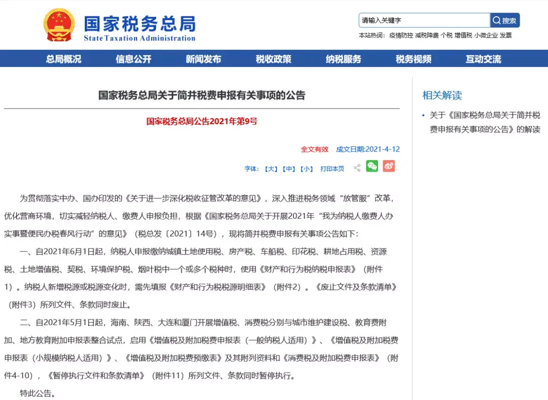 说到印花税的纳税申报问题,这可要算是近期的热点话题了。根据《国家税务总局关于简并税费申报有关事项的公告》(国家税务总局公告2021年第9号)规定,自2021年6月1日起,纳税人申报缴纳印花税等一个或多个税种时,将使用《财产和行为税纳税申报表》进行统一申报,即财产和行为税合并申报!这大大减少了我们财务人员的纳税申报次数。