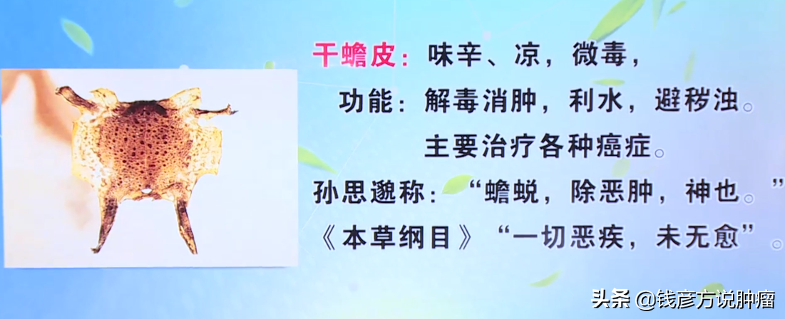 干蟾皮实际上是我们临床上治疗消化道肿瘤的一副常见方剂,其功能是解毒消肿、沥水、避秽浊。中医在治疗各种癌症的时候常用到这副药,孙思邈称:“蟾蜕、除恶臭、神也”。《本草纲目》中也提到干蟾皮“一切恶疾,未无愈“,也就是没有不治愈的。