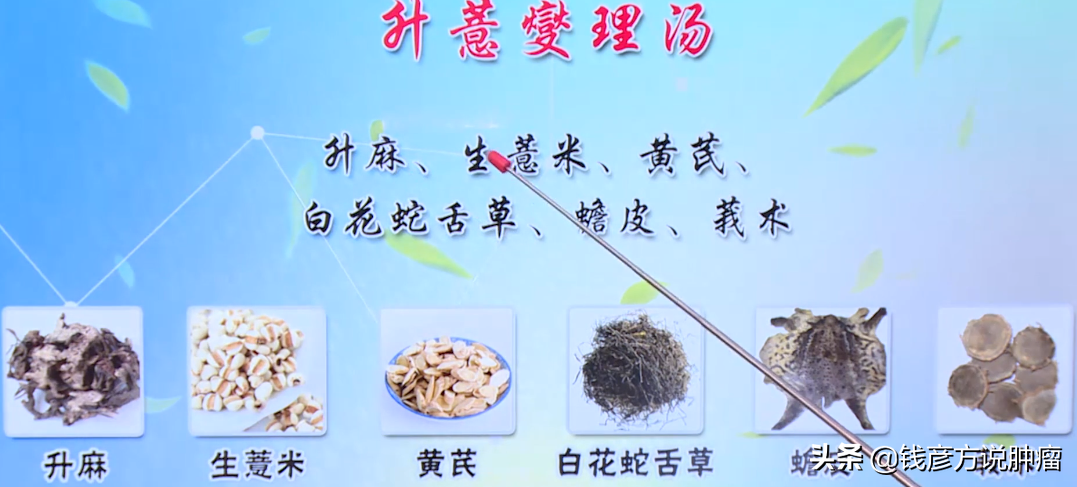 升薏燮理汤由多种中草药与动物药组成,其中升麻是升阳的,薏米可以起到健脾化湿的作用,黄芪能做到益气健脾、益气补气,百花蛇舌草帮助清热解毒、散结。