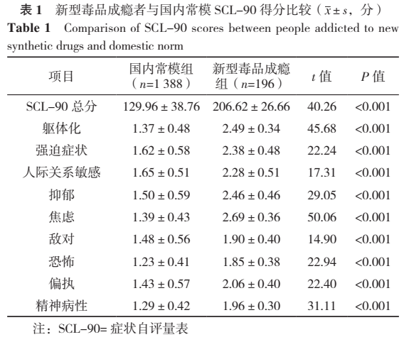新型毒品成瘾组SCL-90总分及各维度得分均高于国内常模组(正常人SCL-90)[11],差异有统计学意义(P<0.001),见表1。