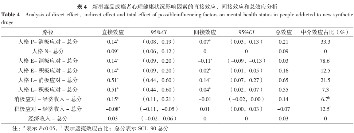 Bootstrap检验中介效应结果显示,人格特征各维度、应对方式对新型毒品成瘾者心理健康状况均具有直接效应(P<0.05),并且应对方式在人格特征与新型毒品成瘾者心理健康状况中起部分中介作用,其中消极应对分别在人格P、人格L与新型毒品成瘾者心理健康状况之间存在显著中介效应;积极应对分别在人格E、人格L与新型毒品成瘾者心理健康状况之间存在中介效应(P<0.05),见表4。