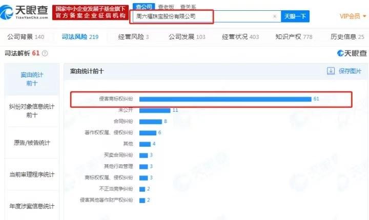 根据天眼查显示,周六福的司法风险多达219条,其中涉及商标侵权纠纷就有60条。
