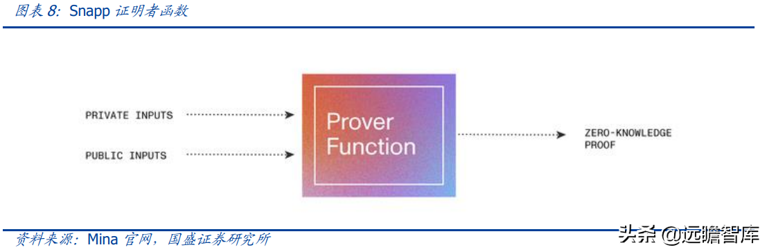 具体运行上,证明功能在用户的 web 浏览器上完成,其生成的零知识证明(验证密钥)则会被存储在给定 Snapp 账户的链上,之后发送至 Mina 网络进行验证。