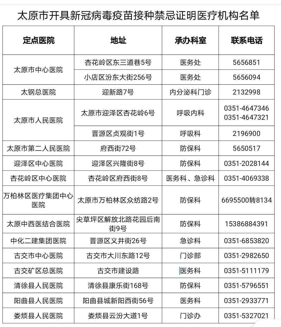 为进一步推进新冠病毒疫苗接种工作,做到适龄人群且无接种禁忌新冠病毒疫苗“应接尽接”,8月26日,太原市疫情防控办下发通知,指定了14所医疗机构为开具接种禁忌证明的定点医院,并明确了接种禁忌判定原则及开具流程。