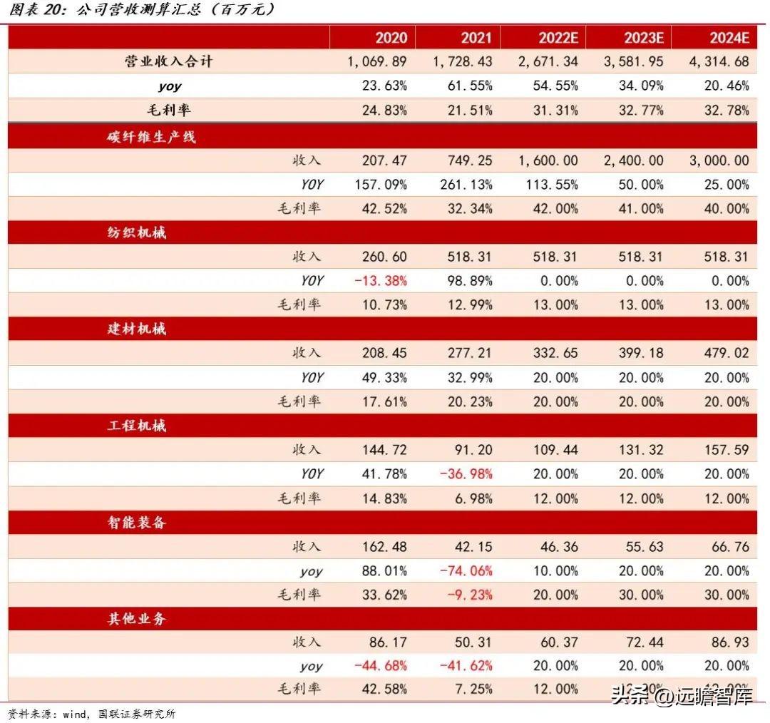 碳纤维生产线:2021年公司签署了10条碳化线的销售合同,单线合同价1.66亿左右,交付期一般在1年内,我们判断21年合同主要在22年转化为收入,预计2022年收入为16亿元,考虑到公司“十四五”期间潜在订单93亿元,假设2023/2024年分别完成订单15/20条,对应收入约为24/30亿元;毛利率方面2021年受原材料影响较大,我们认为恢复至正常水平应该在40%左右。