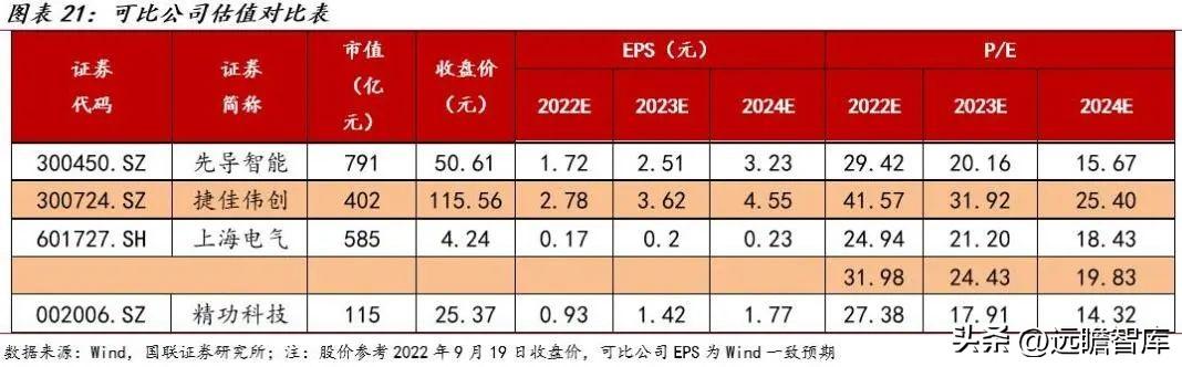 可比公司选择:受益于风电/光伏/氢能等产业的需求,碳纤维需求快速增长,公司作为碳纤维设备核心供应商业绩有望实现高速增长,且按照2022年中报,碳纤维板块毛利占比已经高达72%,基于此,我们认为精功科技对标新能源相关设备标的,我们选取锂电设备标的先导智能、光伏设备标的捷佳伟创、风电设备标的上海电气作为公司的可比公司。
