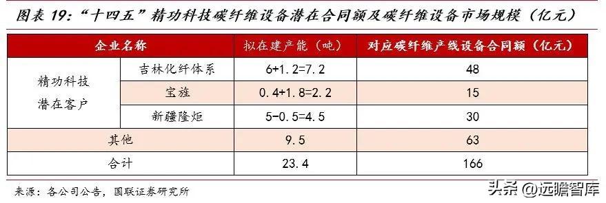 此外,其他扩产厂商拟在建产能约为9.5万吨,对应设备市场规模约为63亿元,“十四五”期间碳纤维产线设备市场总规模约为166亿元。