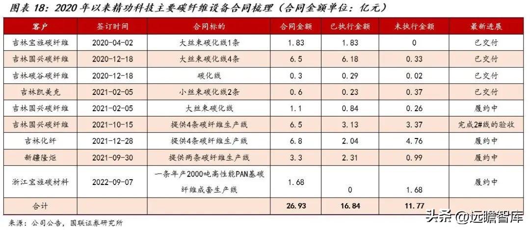 17年11月,公司与吉林精功碳纤维有限公司再次签署《大丝束碳纤维成套生产线销售合同》,合同总金额2.25亿元,由于设备进口渠道不畅,该产线(吉林精功2号线)19年6月投入使用。