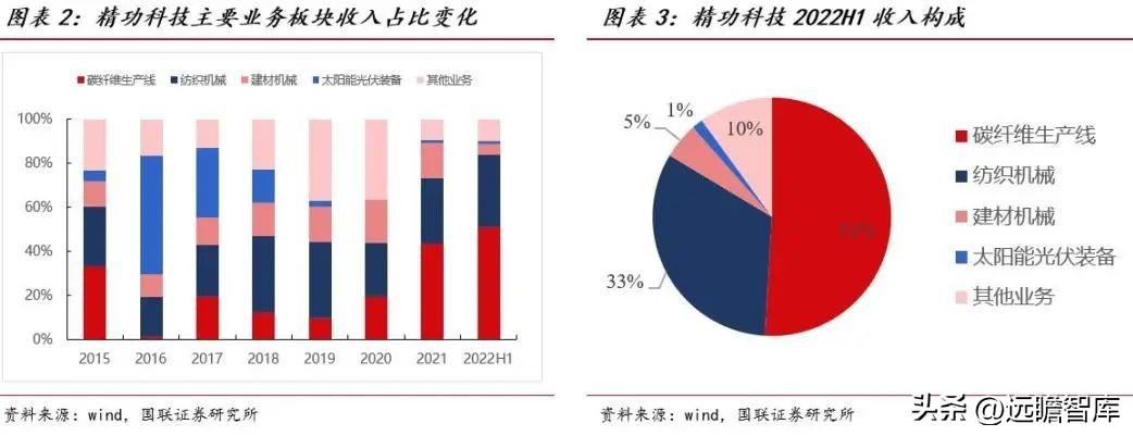 公司专注于设备制造,但是业务范围在不断延伸、扩展。上市之初,公司的业务集中在建材机械、纺织机械。经过多年的发展,目前的公司业务延伸到碳纤维及复合材料装备、机器人及智能装备、太阳能光伏专用装备、新型建筑节能专用设备、轻纺专用设备等五个业务方向,其中,碳纤维装备是发展最快、最具潜力的一个业务板块。