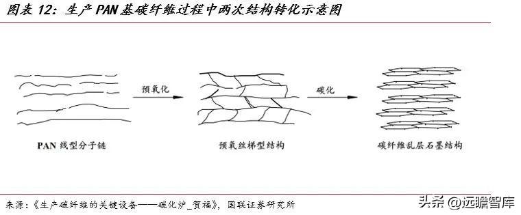 碳化过程中,预氧化炉和低温碳化炉对碳化工序的关键设备。在制造聚丙烯腈基碳纤维过程中, PAN结构经过两次重大变化后由有机原丝转化为无机碳纤维。一是在预氧化过程中,使其线型PAN分子链转化为耐热梯型结构的预氧丝;二是在碳化过程中,由预氧丝的梯型结构转化为碳纤维的乱层石墨结构。
