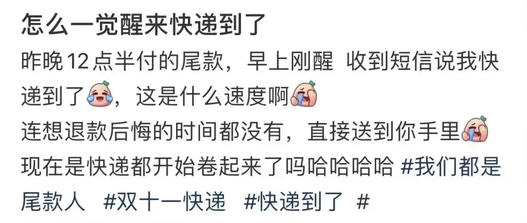 还有不少网友表示,双十一快递送得太快了,想退款连后悔的时间都没有!