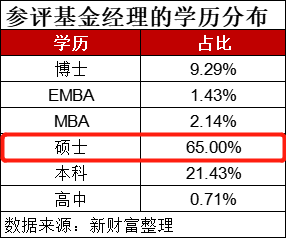 根据新财富数据显示,参与评选的私募基金经理中,硕士是主流,占比超过65%,博士也很多,高达10%,还有EMBA和MBA学历,看来作为投资决策的核心人物,学历高很重要!