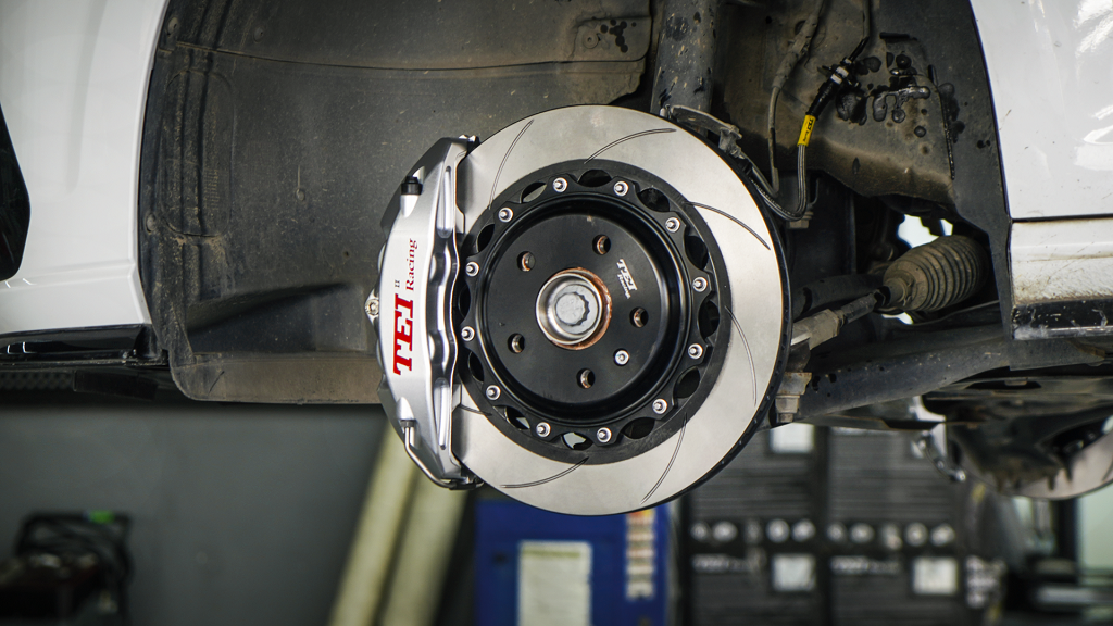 前轮:TEI P40NS(银色)分体锻造四活塞卡钳,原厂17寸轮毂搭配330x28高碳合金热处理划线纹分体盘。