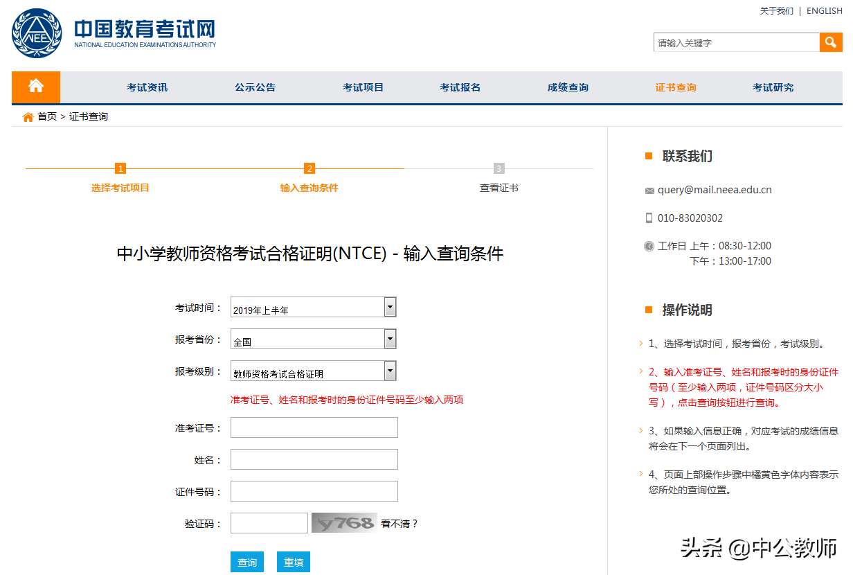 其次:进入“教育部考试中心证书查询系统”,提交相关信息:考试时间选择“2019年上半年”,输入姓名、身份证号、验证码(准考证号可不输入)。