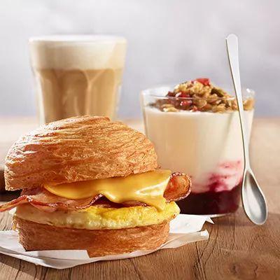 烟熏培根和嫩滑蛋饼作为馅料,加上优质车达芝士放入经典可颂堡中。快用星巴克明星早餐产品说早安~