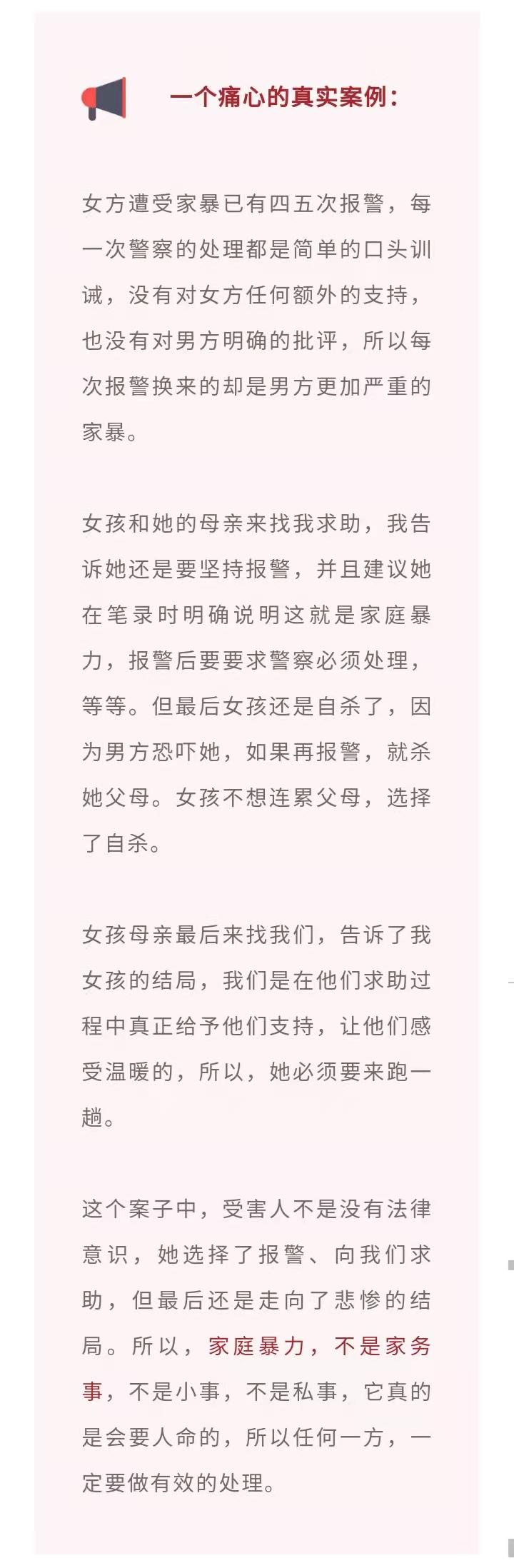 网上有一个说法,“家暴只有0次和无数次”,说的是家暴只要发生就不会停止。我的观点是,如果我们没有在家暴发生的时候进行有效的应对、控制,将它扼杀在萌芽状态,很可能它就会演变成长期性的、反复的家庭暴力(也就是上述的家暴循环)。对于家庭暴力,最好是不要发生,但一旦发生,就要有效地去处理。