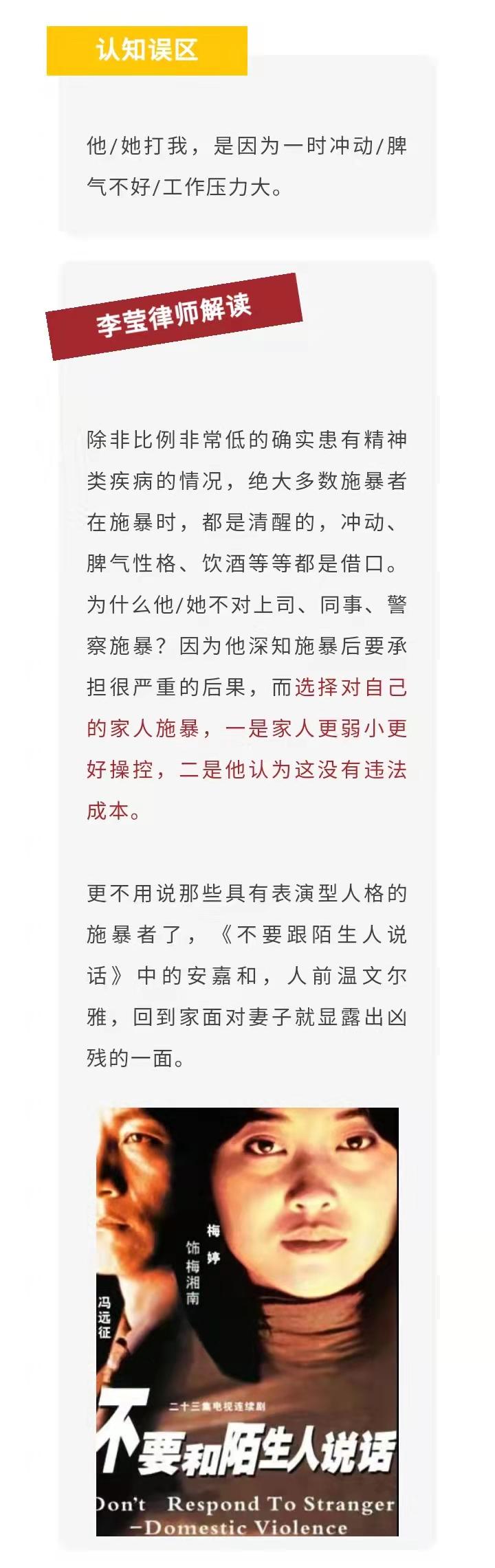 暴力发生期:早期的家庭暴力多数为推一把、打一耳光等看起来没那么严重的行为,也正因为没有造成严重伤害,无论是受害人还是施暴人,都因为没有意识到这是家暴而基本选择淡化处理,施暴人绝大多数都没有道歉,之后很快就有了第二次、第三次、第N次的家暴。