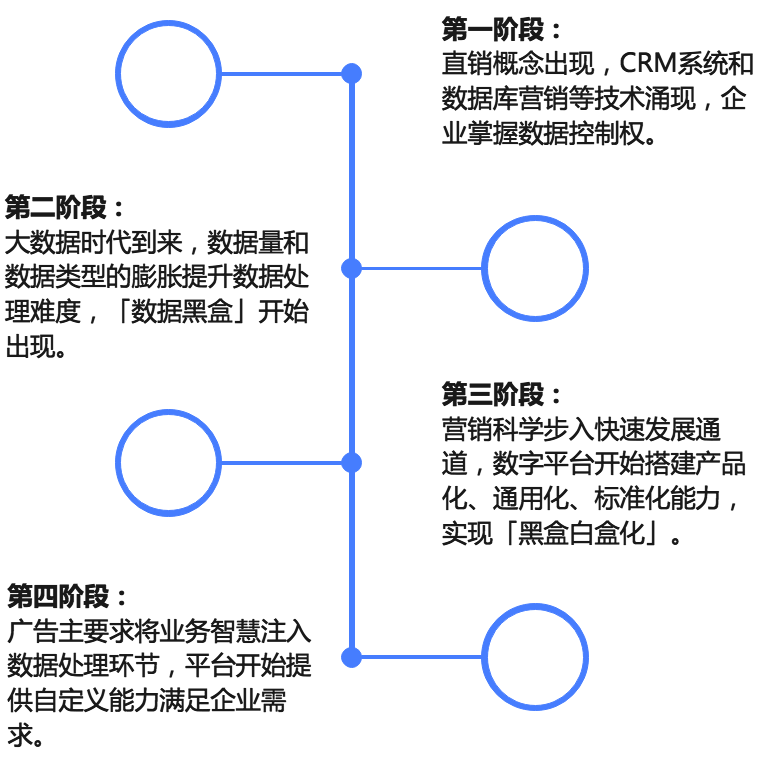 上个世纪中叶,莱斯特·伟门等广告人提出了「直销(Direct Marketing)」的概念,通过直邮、免费电话、忠诚度计划等模式建立与消费者直接沟通的渠道。在这个过程中,数据收集和处理的重要性开始显现出来。从70年代初开始,CRM系统和数据库营销等新技术逐步普及,企业在这个阶段对数据仍然具有较强的控制权。