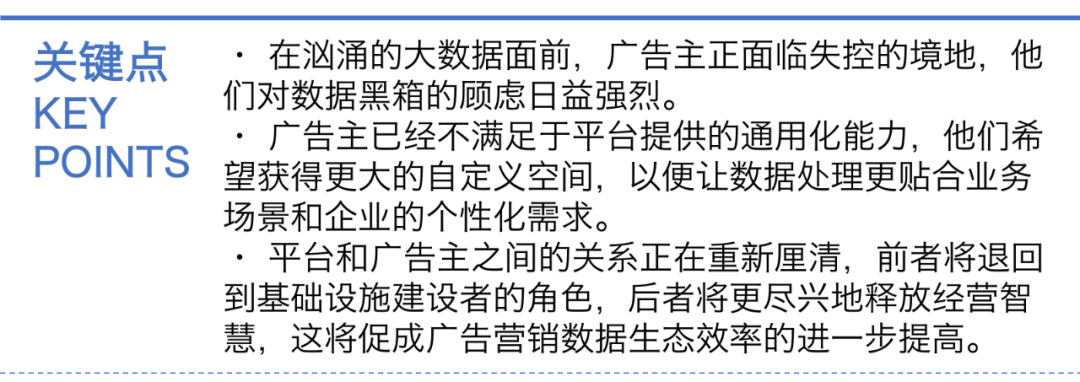 这些案例指向同一个事实:在数字广告生态摸爬滚打十余年后,广告主有了自己的想法。他们发现了潜藏在数据中的庞大商业价值,因此不仅希望获得更多数据,也迫切希望平台为他们创造充分使用数据的条件和环境。