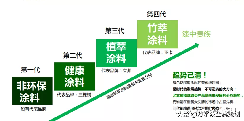 做品牌战略规划,要先对标、然后再定标、最后再立标,这也是国际品牌定位学中的“三标法”,对标就要找到那个“标”。团队通过大数据与市场调研数据发现,立邦刚刚发布了第三代涂料——植萃漆,开辟了一个全新的品类赛道。在经历了近半个月的内部激烈讨论,发现植物萃取是涂料发展的新未来。团队最终决定以植萃漆作为对标蓝本,来细分出适合亚卡的新品类。