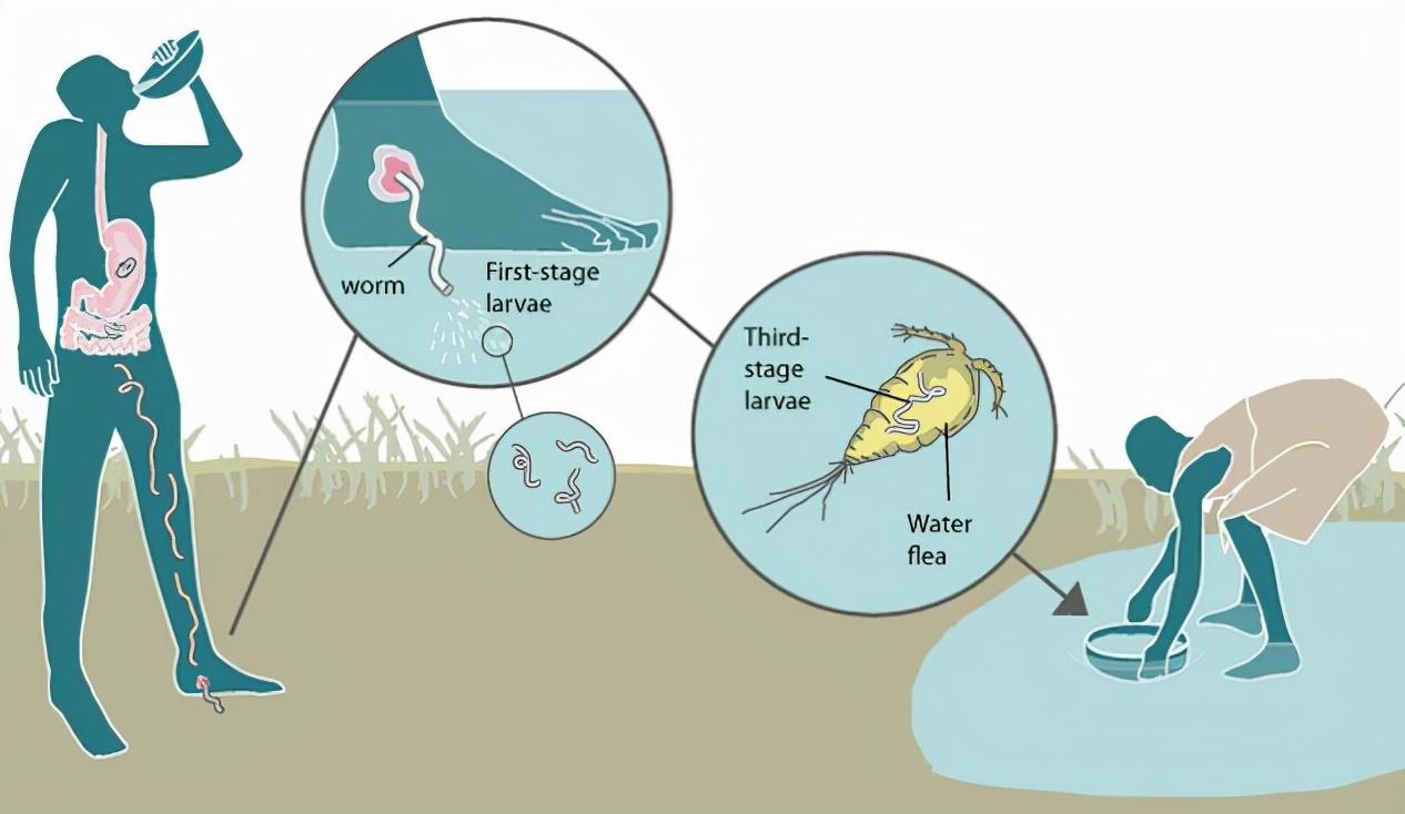 成虫排出的这些幼体很小,会被桡足类动物比如水蚤当成浮游生物摄入体内,但令人遗憾的是这些幼体并不会被水蚤消化,而是寄生于水蚤体内,它们在等待一个机会,与人体接触的机会。