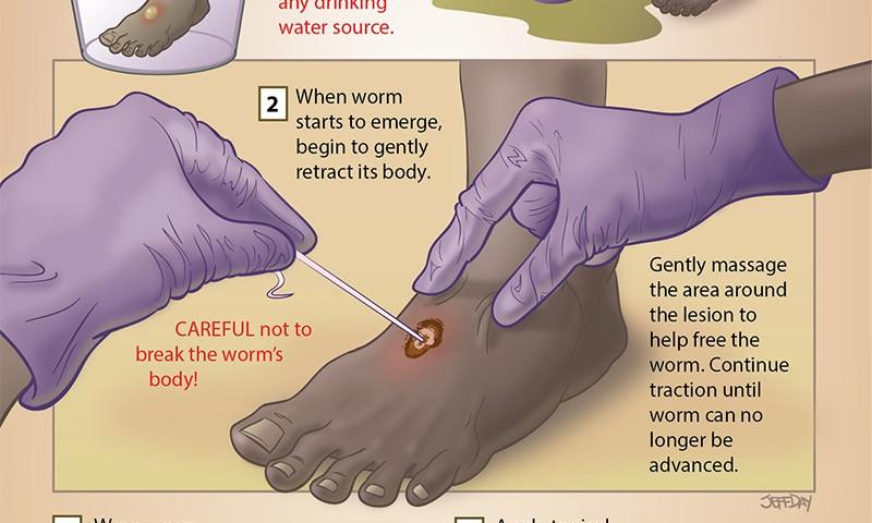 对于龙线虫,唯一的处理方法是等伤口溃烂探出伤口时将其一点点抽出来,而它们身体比较脆弱,不能生拉硬扯,一旦断裂会再次缩回体内,只能将其慢慢拉出来,而这个过程可能长达数天,因此一般的处理方法是将其绑扎在一根小木棍上,然后出来一点卷一点,一直将其卷完为止。