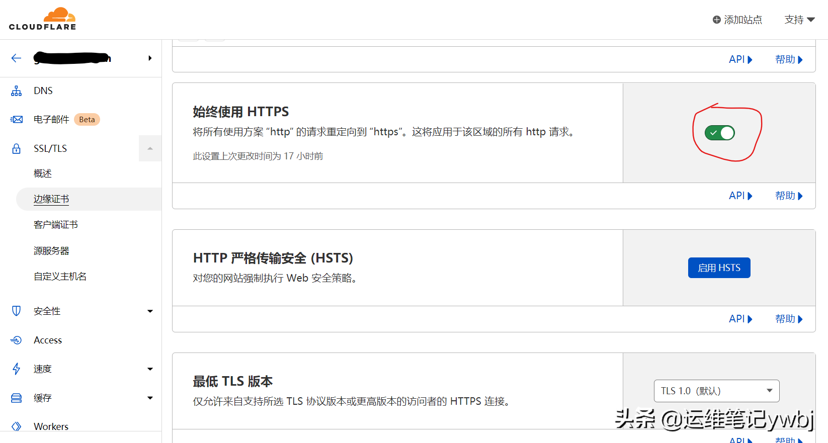 Cloudflare配置完域名,记得开启‘始终使用 HTTPS’功能。