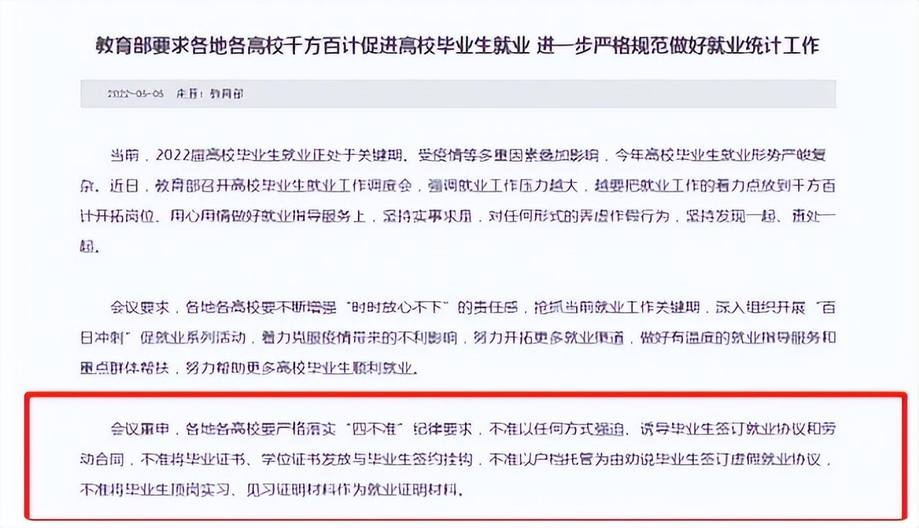 但是今年的就业压力较大,即使社会各界积极努力,仍存在就业困难的情况。为了不影响高校招生,也为了确保就业真实性,教育部传来了喜讯,要求大学认真履行“四不准”要求,以此为大学生就业保驾护航。