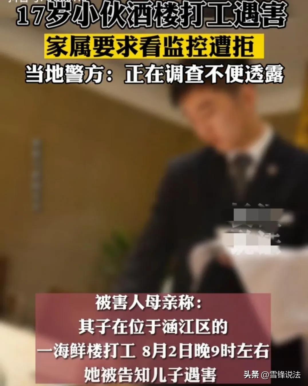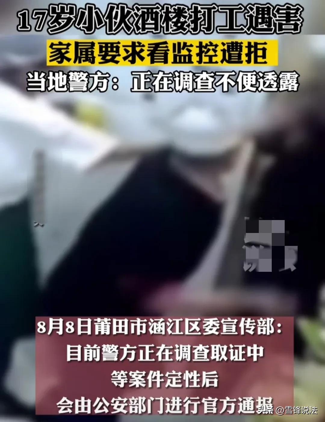 8月8日,福建莆田一名网友爆料,一17岁小伙在涵江区某酒楼打工时被陌生人捅死,其母亲要求查看事发当天监控视频遭到拒绝。