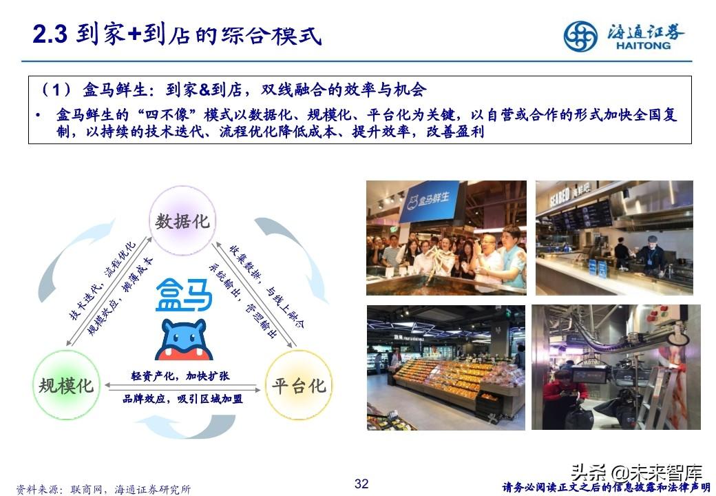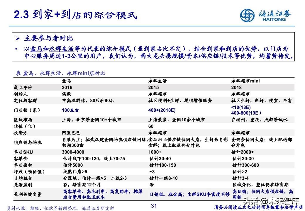 1、每日优鲜:在全国10大核心城市建立城市分选中心+社区 配送中心,据亿邦动力网报道,一线城市整体盈利;2、叮咚买菜:提供“0配送费+0起送额、29分钟送达”的 到家服务,据《商业观察家》报道,在上海有200余个前臵仓,2019年初进入杭州,测算日均订单1250单时基 本盈亏平衡;3、朴朴超市:深耕福州市场,据搜狐新闻报道,预计2018年底前置仓约30个,并拟向厦门、武汉 等地扩张,因补贴力度较大,尚未盈利。到家+到店的综合模式。结合到家和到店优势,满足用户全渠道消费需求,但线上培育期拉低毛利率,对门店 运营、供应链、技术等综合要求高。