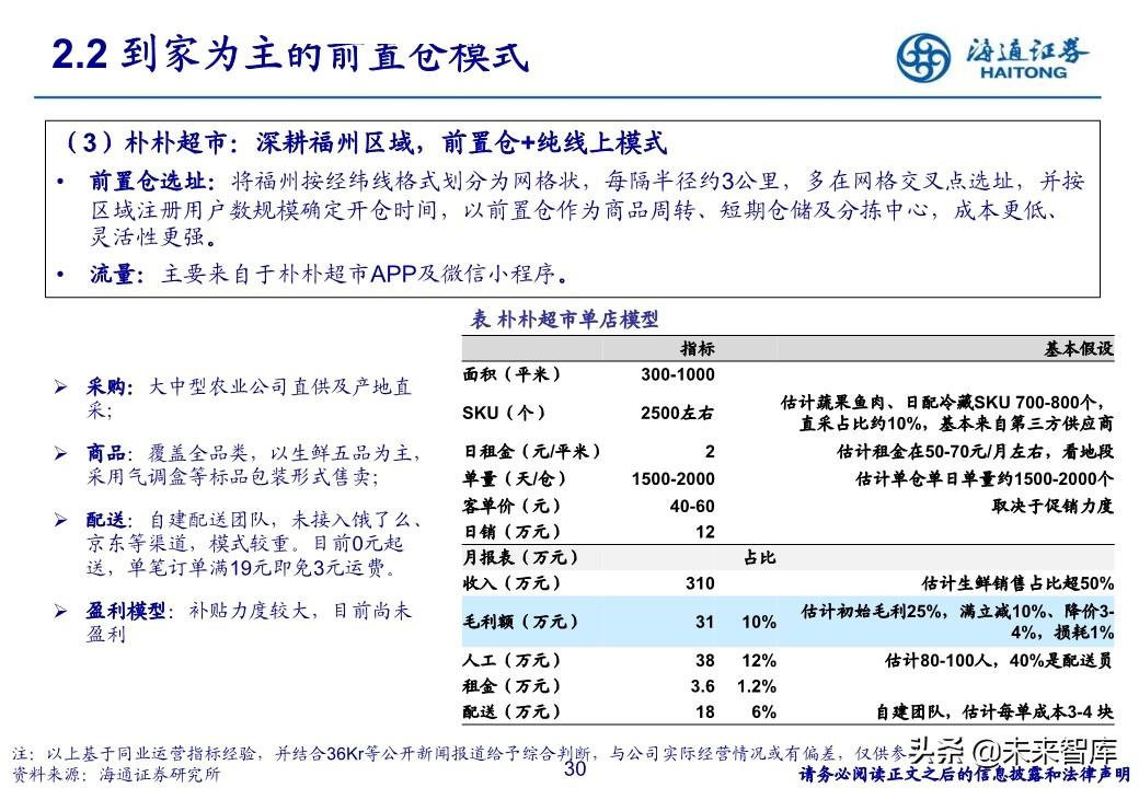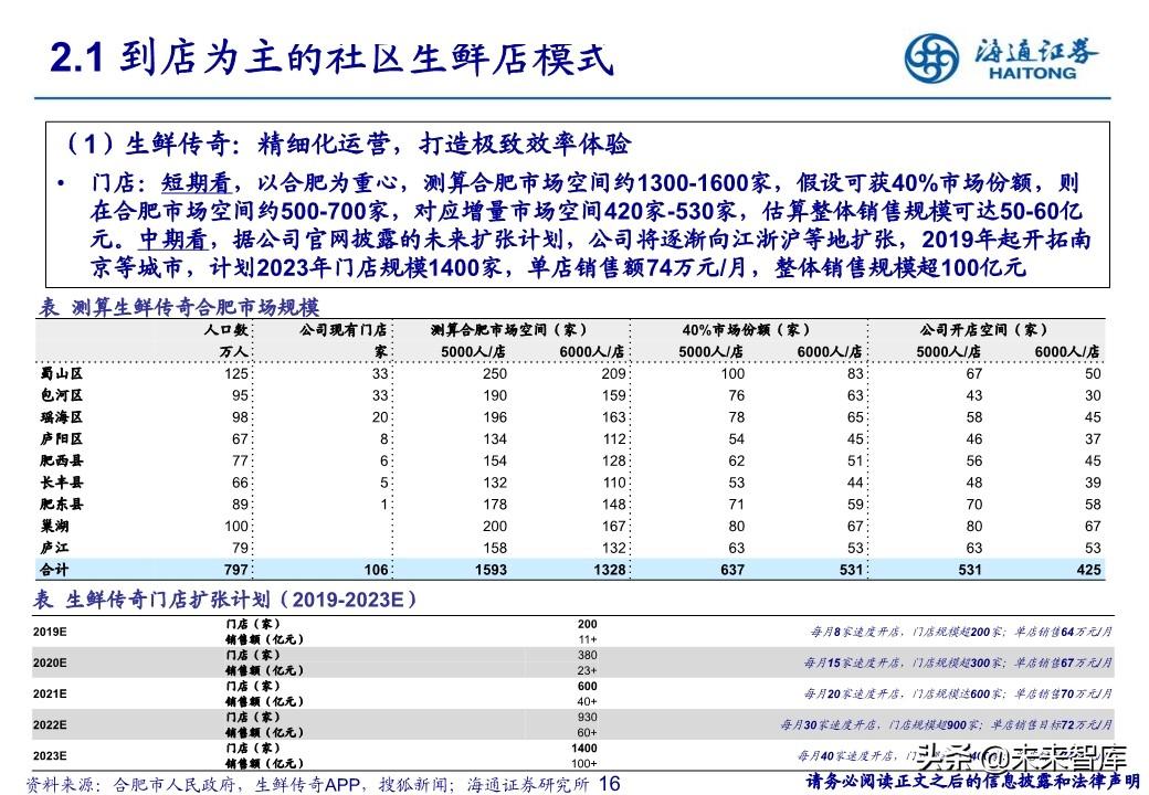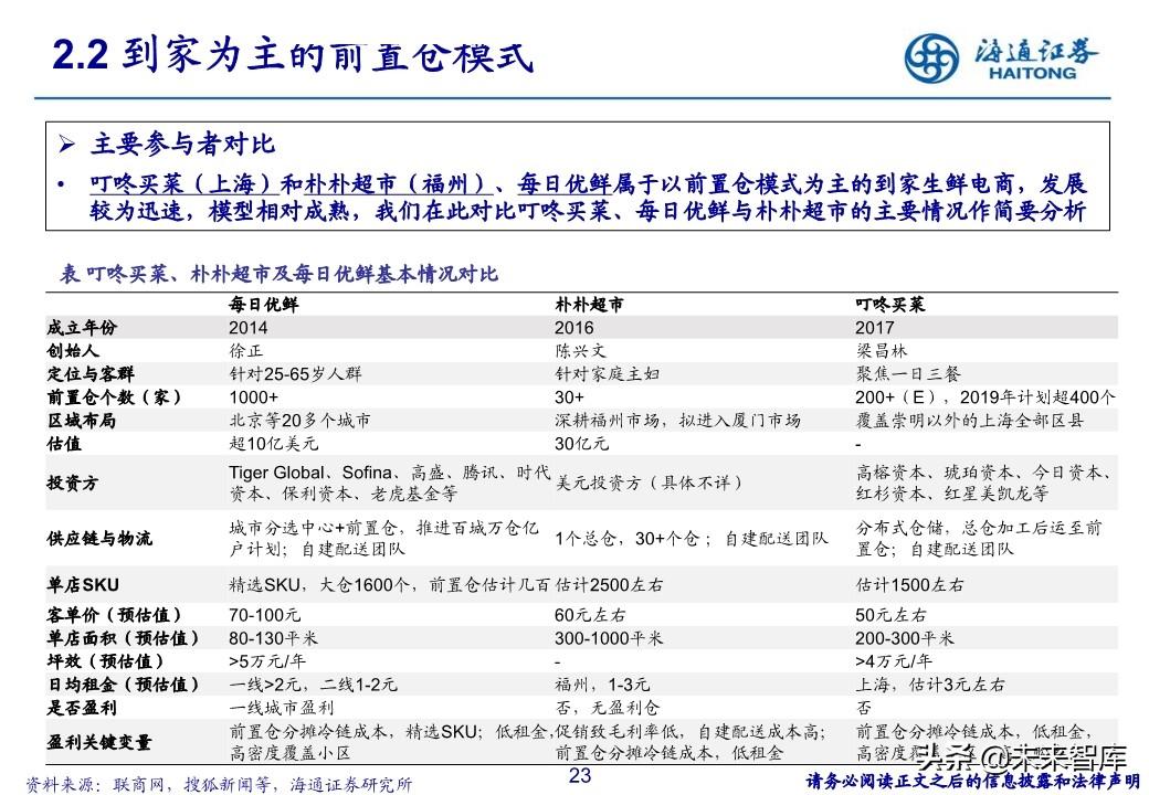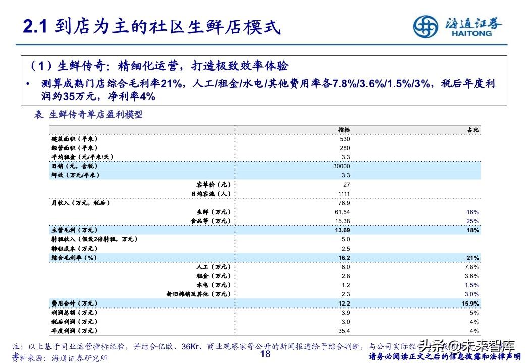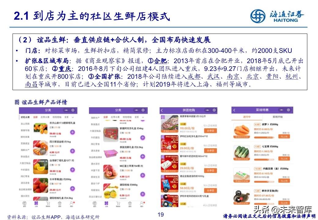 1、生鲜传奇:五定原则打造标准化门店,选品策略宽而浅,自有品牌&基地直采,据生鲜传奇 APP显示,合肥门店数超100家;测算单店坪效3.3万元/平米时,净利率可达4% 。2、谊品生鲜:垂直供应链& 合伙人制快速展店,据《商业观察家》报道,2018年底近400家门店覆盖11省,预计2019年开店至1000家;测 算成熟店日销5万元,分红除税后净利率3% 。纯到家的前置仓电商模式。将前置仓建在社区周边,配送效率及物业可获取性高,注重到家体验、商品品质与 复购率,初期拉新若过度促销会严重损耗毛利率。