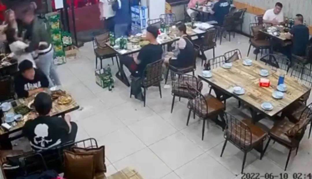 男子惊叫一声,这时候从外面突然冲进来5-6个壮汉,他们不由分说对着黑衣女子就是一阵拳打脚踢,甚至有人抓起盘子、举起椅子,朝着已经蜷缩在地不敢动弹的黑衣女孩狠狠砸去。