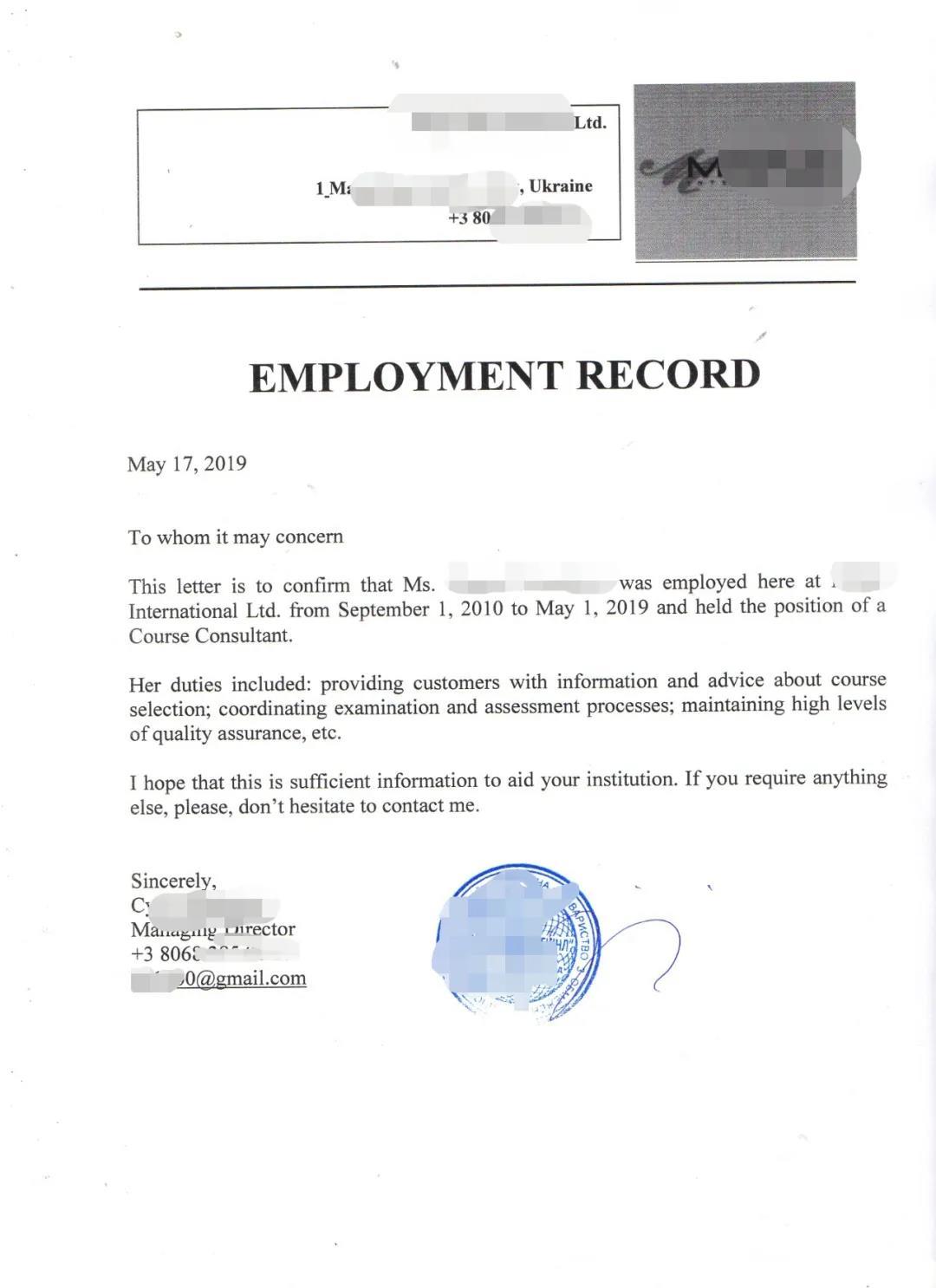 工作经历证明是指:外国人大学毕业以后,由其原工作过的单位出具从事与现聘用岗位工作相关的2年以上工作经历证明,包括职位、工作时间或曾经做过的项目,需其原工作单位加盖公章或负责人签字,并留有证明联系人有效联系电话或电子邮件。The work experience certificate refers to: after the foreigner graduated from the University, the work experience certificate of more than 2 years related to the current employment position issued by the original work unit of the foreigner, including the position, working time or the project that he has done, shall be stamped with the official seal of the original work unit or signed by the person in charge, and the effective contact telephone number or email of the certified contact person shall be kept.