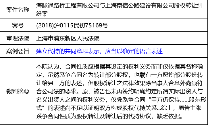 截止本周,本团队针对发生在上海所有法院的有关“股权代持关系”判决进行检索,除去管辖、执行、及股权转让类纠纷,案件样本共计262件,结合团队对案件样本的分析,可知法院认定股权代持关系存在的核心在于代持合意的认定。由于代持合意审判实践中往往难以直接得出,需要借助出资、实际行使股东权利等间接条件进行判断,因此我们摘取了如下代表性案例,便于直观理解。