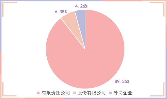 在股权代持类案件中,有限责任公司占绝大多数,占比89.36%,股份有限公司占比6.38%,外商企业4.26%件。