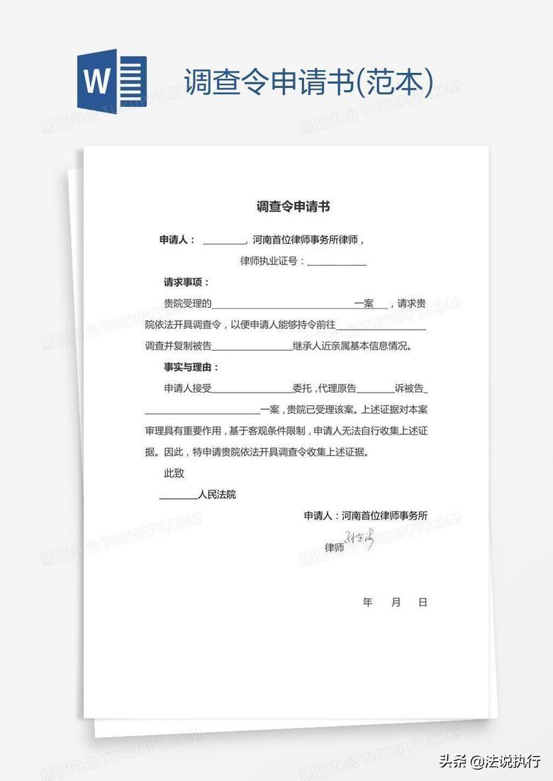 申请执行人和他的律师在向被调查人调查有力证据的时候,遇见了困难的,这样才可以以书面形式向执行法院进行申请调查令。法院会对申请书写明证据的所在地,表现形式,名称以及需要证明的其他事实。