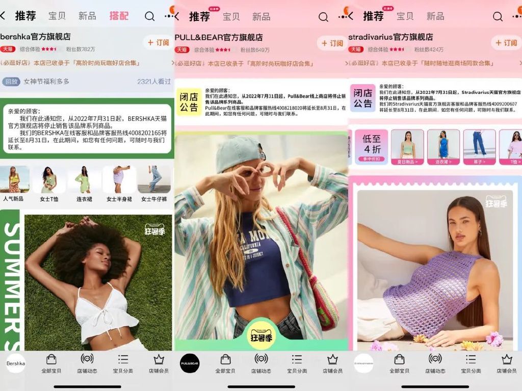 从7月31日开始,Zara的三个姐妹品牌 -- Bershka、Pull&Bear和Stradivarus将同时关闭天猫旗舰店。线上店铺关停,再加上线下实体店早已陆续闭店,入华十余载,这三个快时尚品牌算是彻底告别中国了。