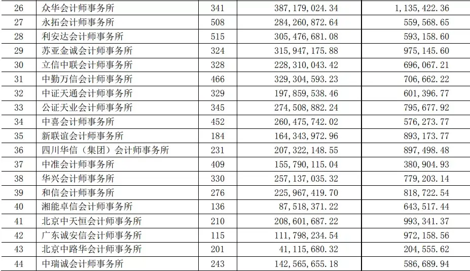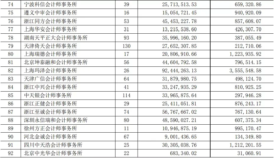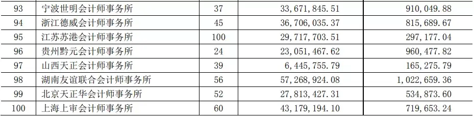 2020年度百家排名事务所中,有73家在100万元以内,21家在100万元至200万元之间,6家在200万元以上,1家(普华永道中天)在400万元以上。