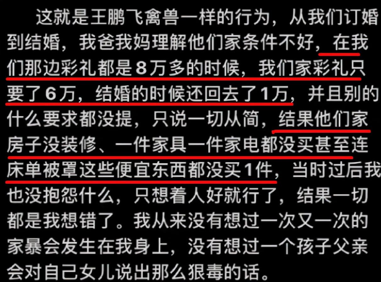 不久后妻子发出来的自述证明了一点,在那份长长的自述中,她说她下嫁给王鹏飞,但结婚怀孕后,王家对她的态度大变。