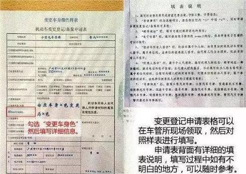 《中华人民共和国公安部令》,《机动车登记规定》,里面的条款规定如下:第十条 已注册登记的机动车有下列情形之一的,机动车所有人应当向登记地车辆管理所申请变更登记: (一)改变车身颜色的; (二)更换发动机的; (三)更换车身或者车架的; (四)因质量问题更换整车的; (五)营运机动车改为非营运机动车或者非营运机动车改为营运机动车等使用性质改变的; (六)机动车所有人的住所迁出或者迁入车辆管理所管辖区域的。 机动车所有人为两人以上,需要将登记的所有人姓名变更为其他所有人姓名的,可以向登记地车辆管理所申请变更登记。 属于本条第一款第(一)项、第(二)项和第(三)项规定的变更事项的,机动车所有人应当在变更后十日内向车辆管理所申请变更登记;属于本条第一款第(六)项规定的变更事项的,机动车所有人申请转出前,应当将涉及该车的道路交通安全违法行为和交通事故处理完毕。