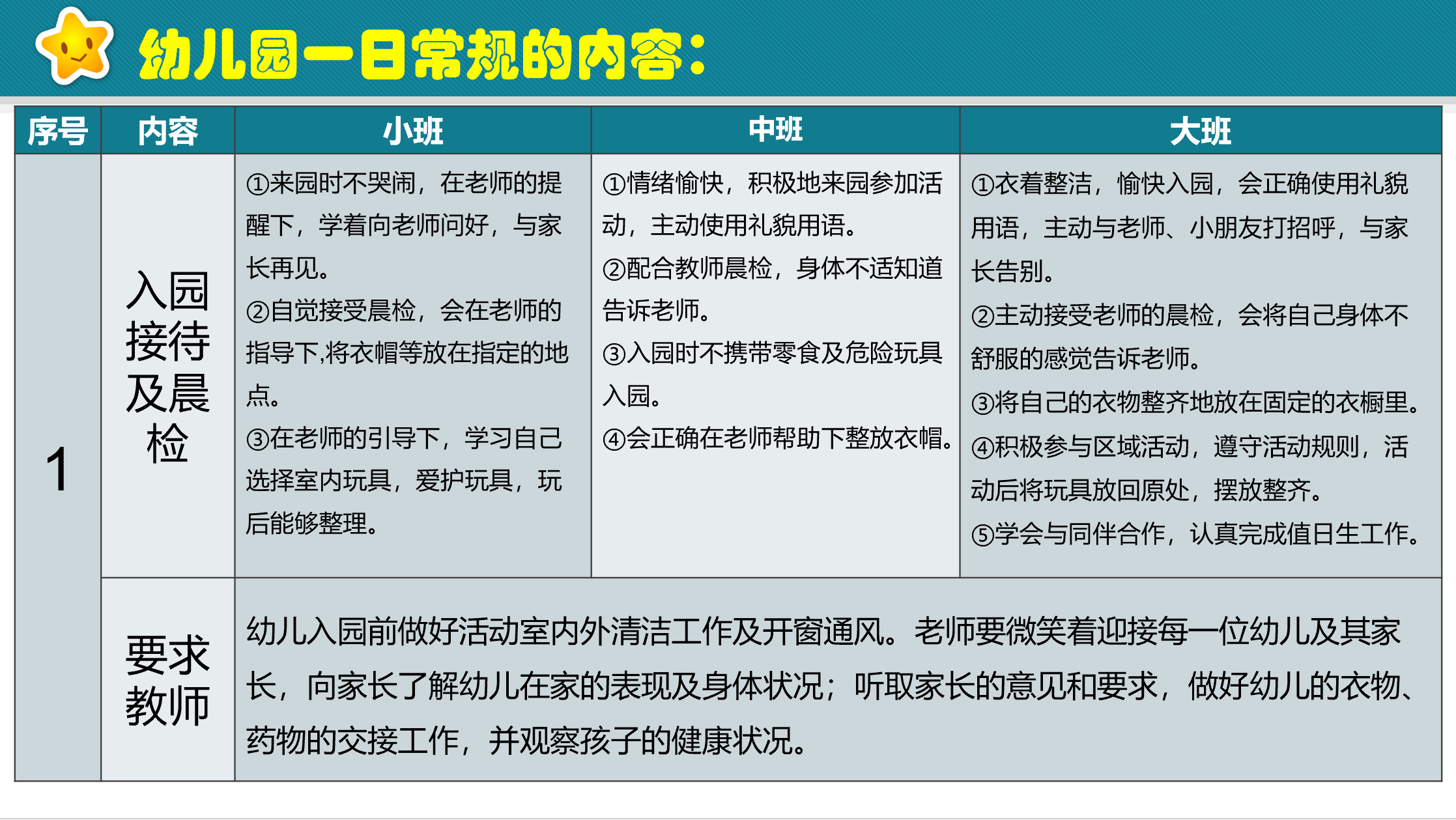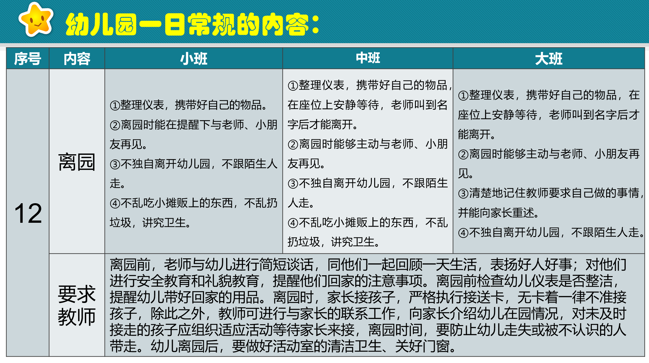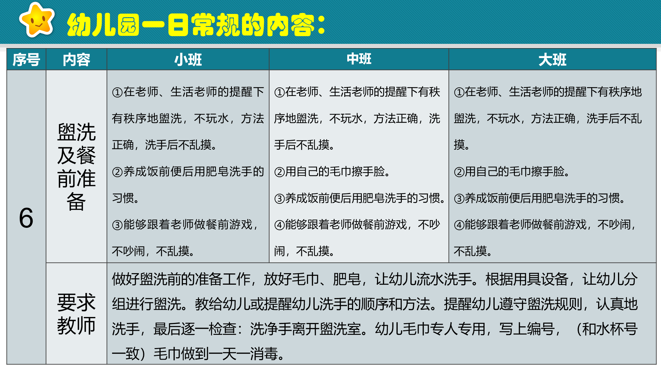 3、一日常规的具体要求,采用对比式贯穿设计,在主页面的小、中、大班的不同要求一目了然;