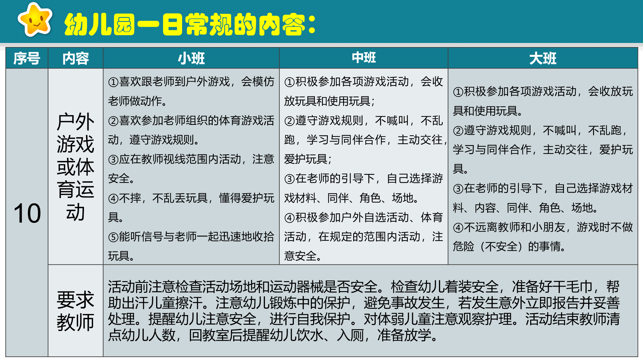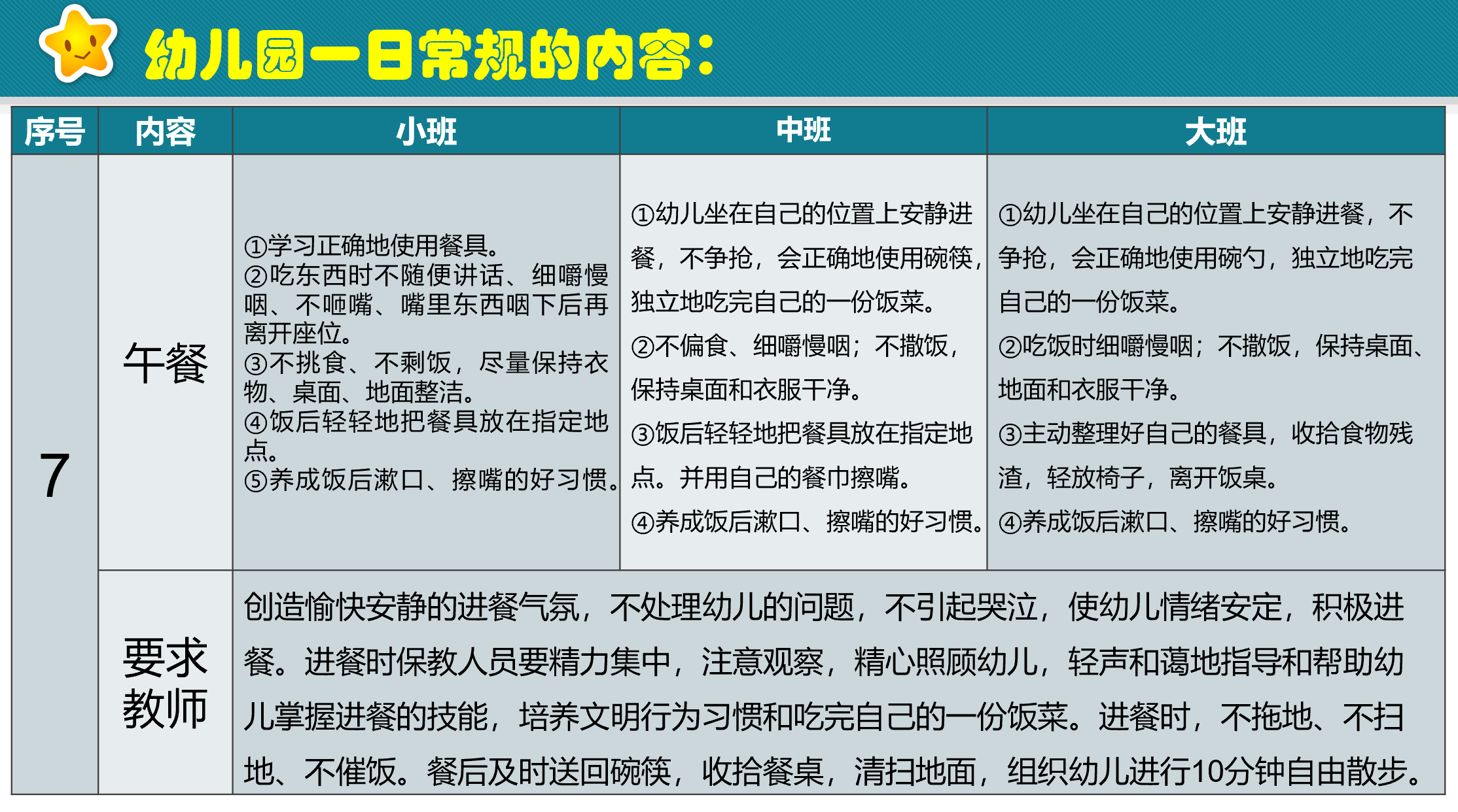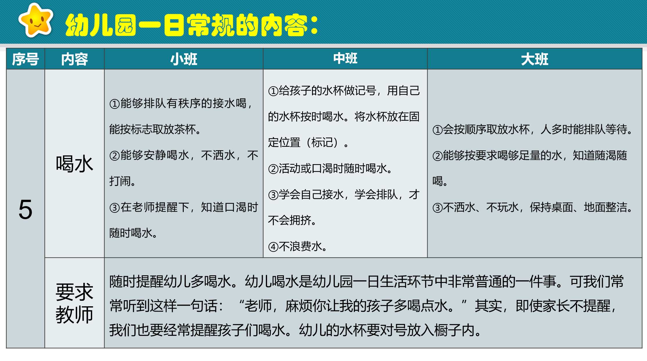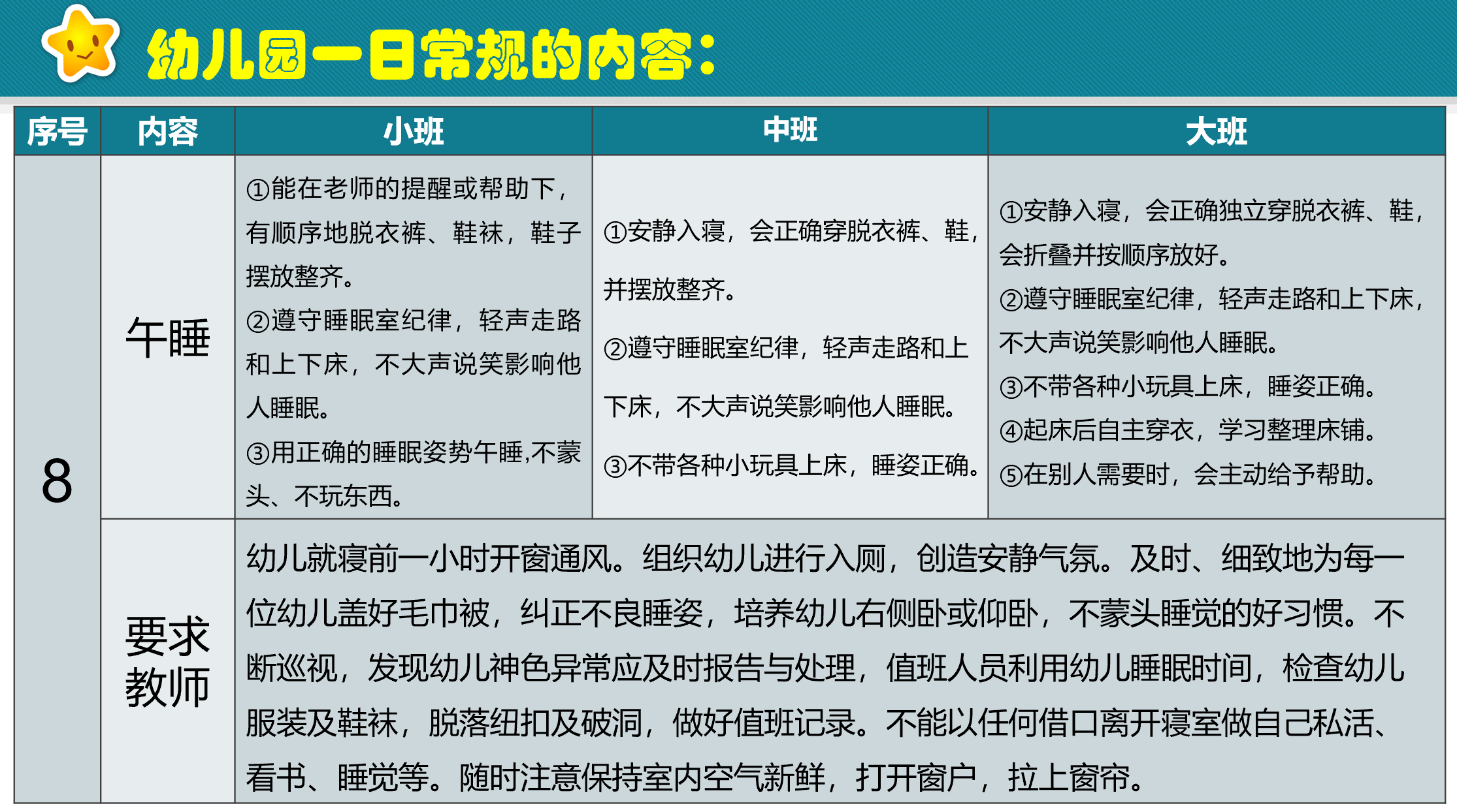 3、一日常规的具体要求,采用对比式贯穿设计,在主页面的小、中、大班的不同要求一目了然;