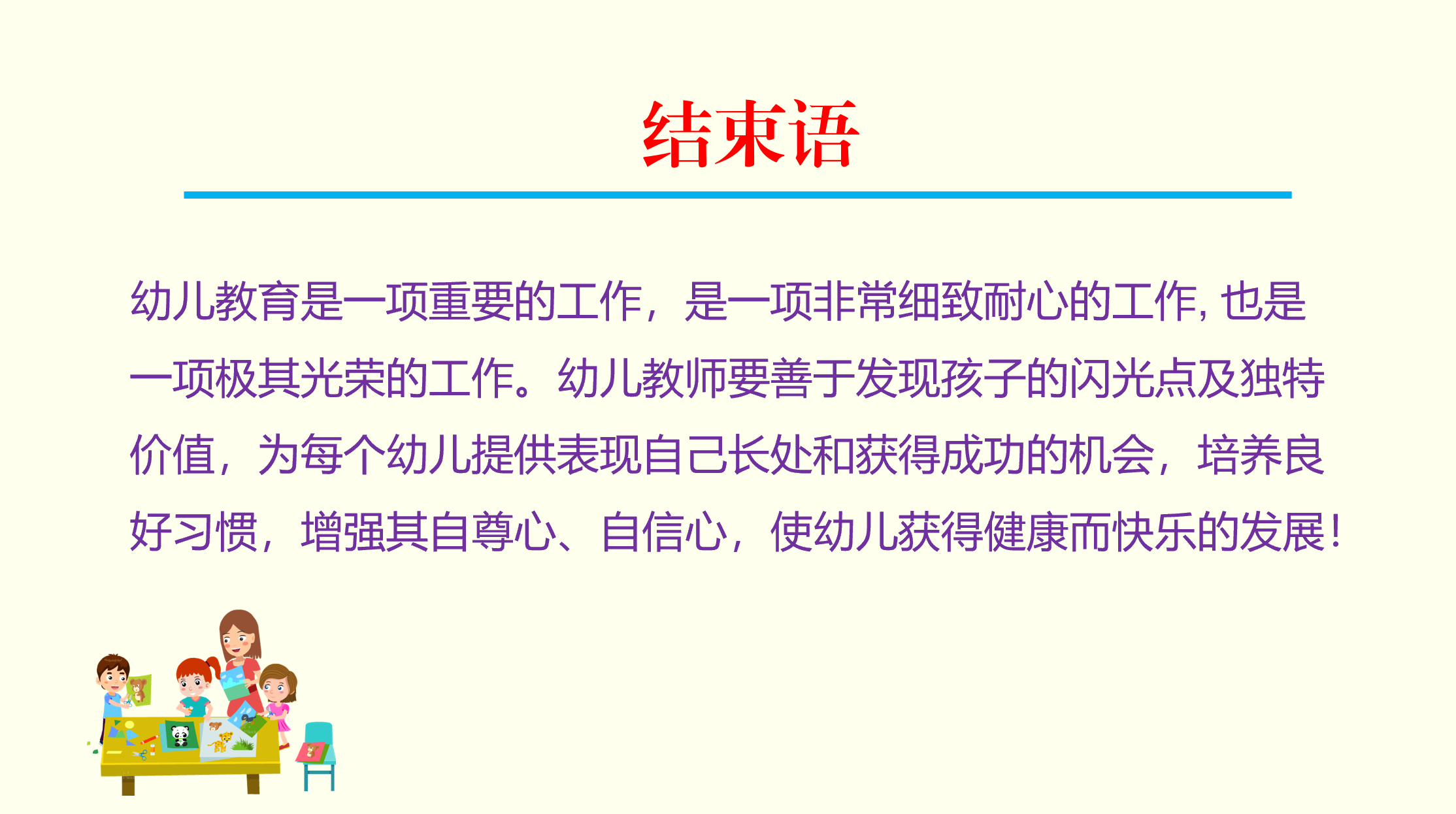 幼儿教育是一项重要的工作,是一项非常细致耐心的工作, 也是一项极其光荣的工作。幼儿教师要善于发现孩子的闪光点及独特价值,为每个幼儿提供表现自己长处和获得成功的机会,培养良好习惯,增强其自尊心、自信心,使幼儿获得健康而快乐的发展!