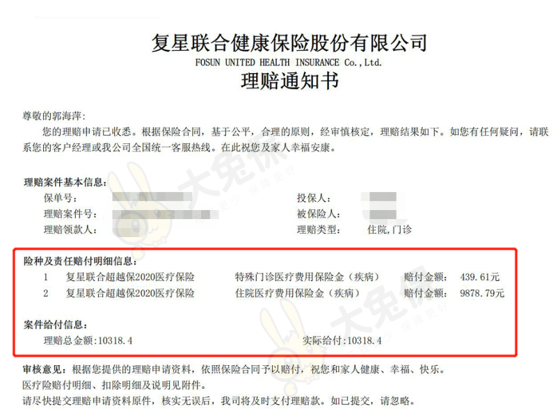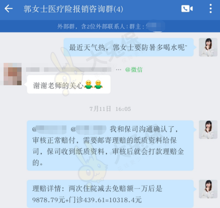 有专业的人给予专业的指导协助,尽量避免为理赔反复奔波,才能安心接受治疗,这才是买保险的本质,像本案例中的郭女士,全流程有大兔保理赔老师跟进协助,拿钱没烦恼,治疗不操心。手动给小谢老师点个赞~