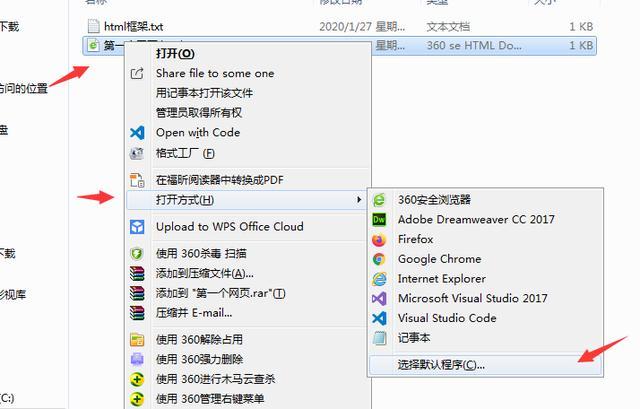第一个页面 右键,使用"记事本"打开"第一个网页.html"文件。如图所示:如果您的"打开方式"中没有"记事本"请点击"选择默认程序"