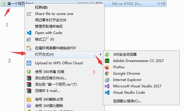 step6:将鼠标移动到"第一个网页.html"文件上,单击右键,选择打开方式,如图: